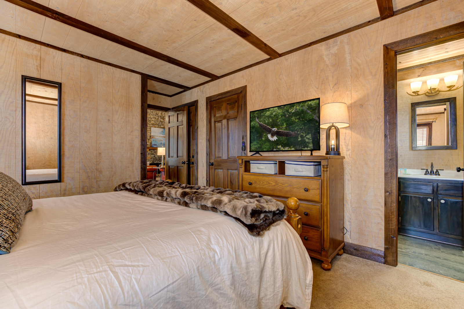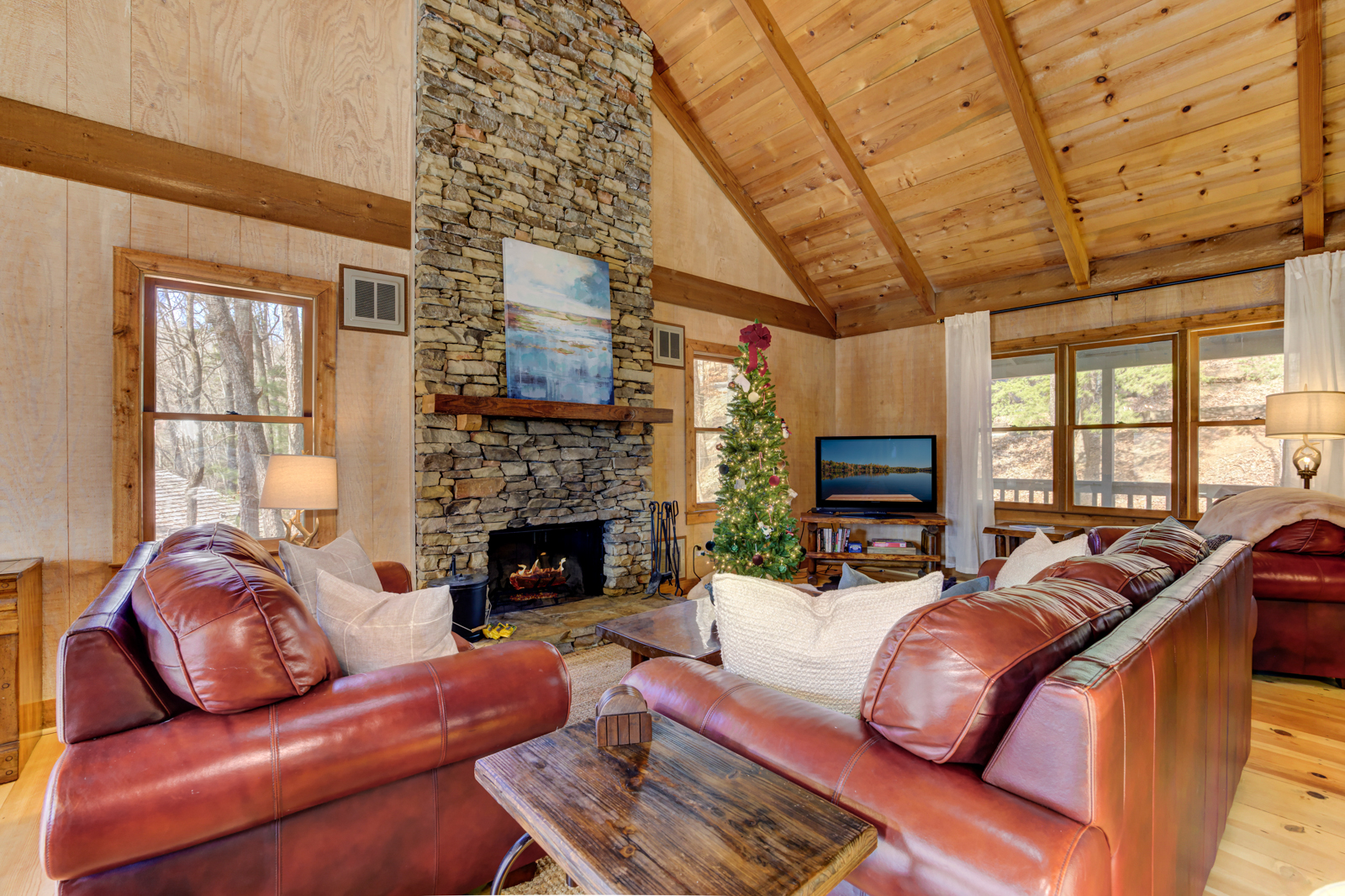 A soaring ceiling with a stacked-stone, wood-burning fireplace, hardwood floors, paneled walls, and charming mountain touches make the open-concept living room at this cabin rental in Big Canoe a cozy place to relax and unwind in the North Georgia mountains. Sip wine and chat with friends as a fire crackles and warms up the room. Switch on the big screen TV for movie nights with popcorn and drinks on the coffee table. And kick back with a good book by a reading lamp every evening.