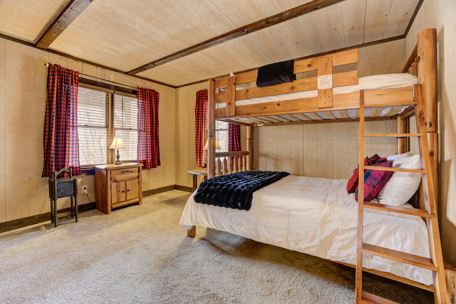 Downstairs, the third bedroom has another queen-size bed, and the fourth bedroom boasts a twin-over-full bunk — both bedrooms connect to the final bathroom. Upstairs, there’s an open loft with another TV setup plus a twin-size daybed with a trundle. It’s a pretty cool space where the kids can hang out during the day as well!