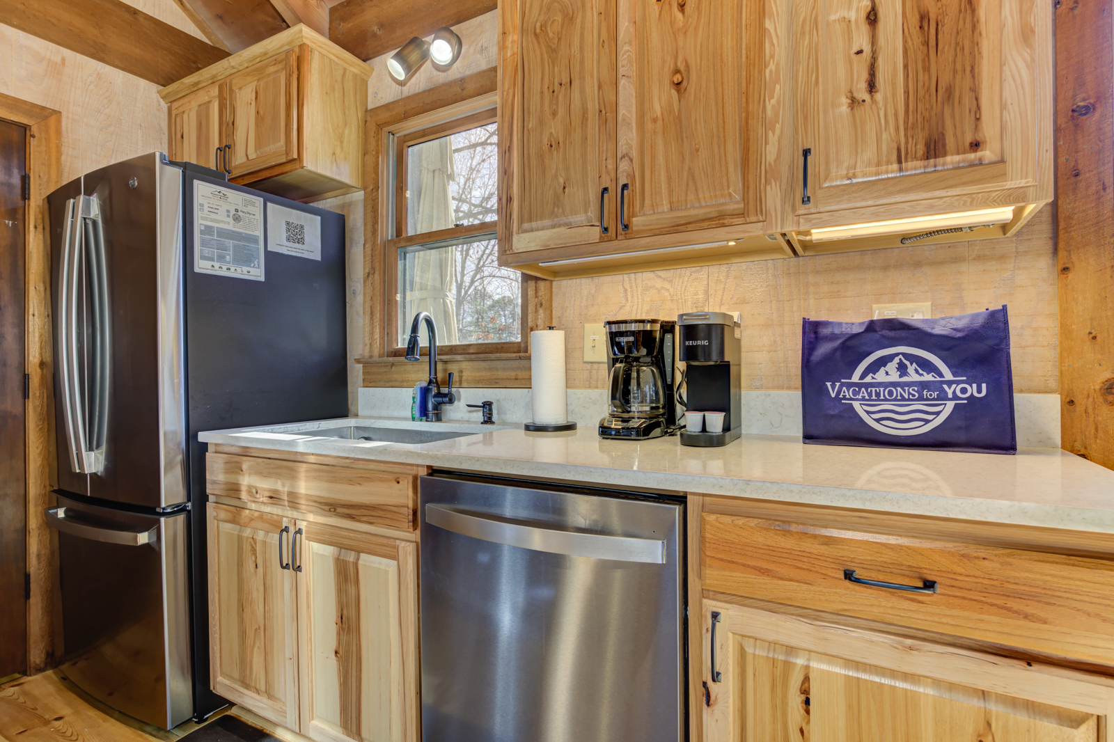 Begin days with breakfast made in the fully equipped, updated kitchen at your North Georgia cabin, featuring natural wood cabinets, stainless steel appliances, beautiful stone countertops, dishes and glassware, cooking tools, and more. Brew some coffee with the drip or Keurig coffeemakers, pop bagels in the oven, or grab a snack out of the double-door refrigerator.