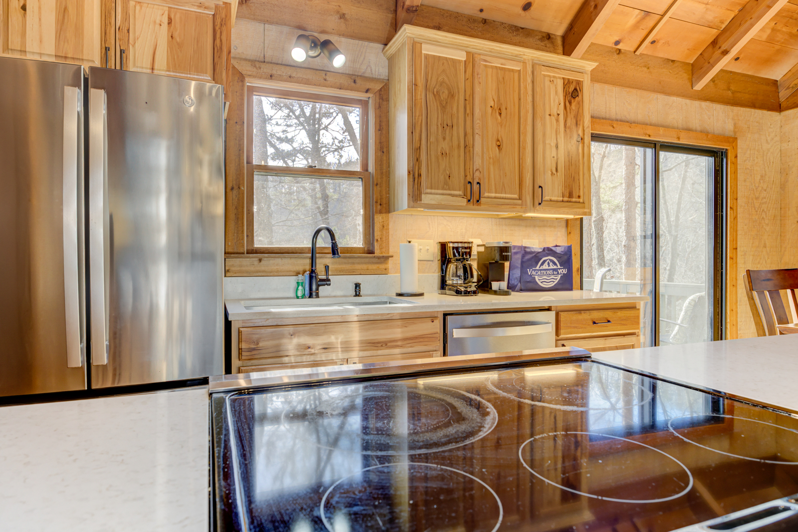 Want to save leftovers from town or cook your favorite recipes while on vacation? This Big Canoe rental features a fully outfitted kitchen — with stone countertops, stainless steel appliances, and natural wood cabinetry, plus pots, pans, dishes, cutlery, glassware, and mugs. Included is a standard drip coffeemaker for pots of joe and a Keurig for single cups anytime.Â