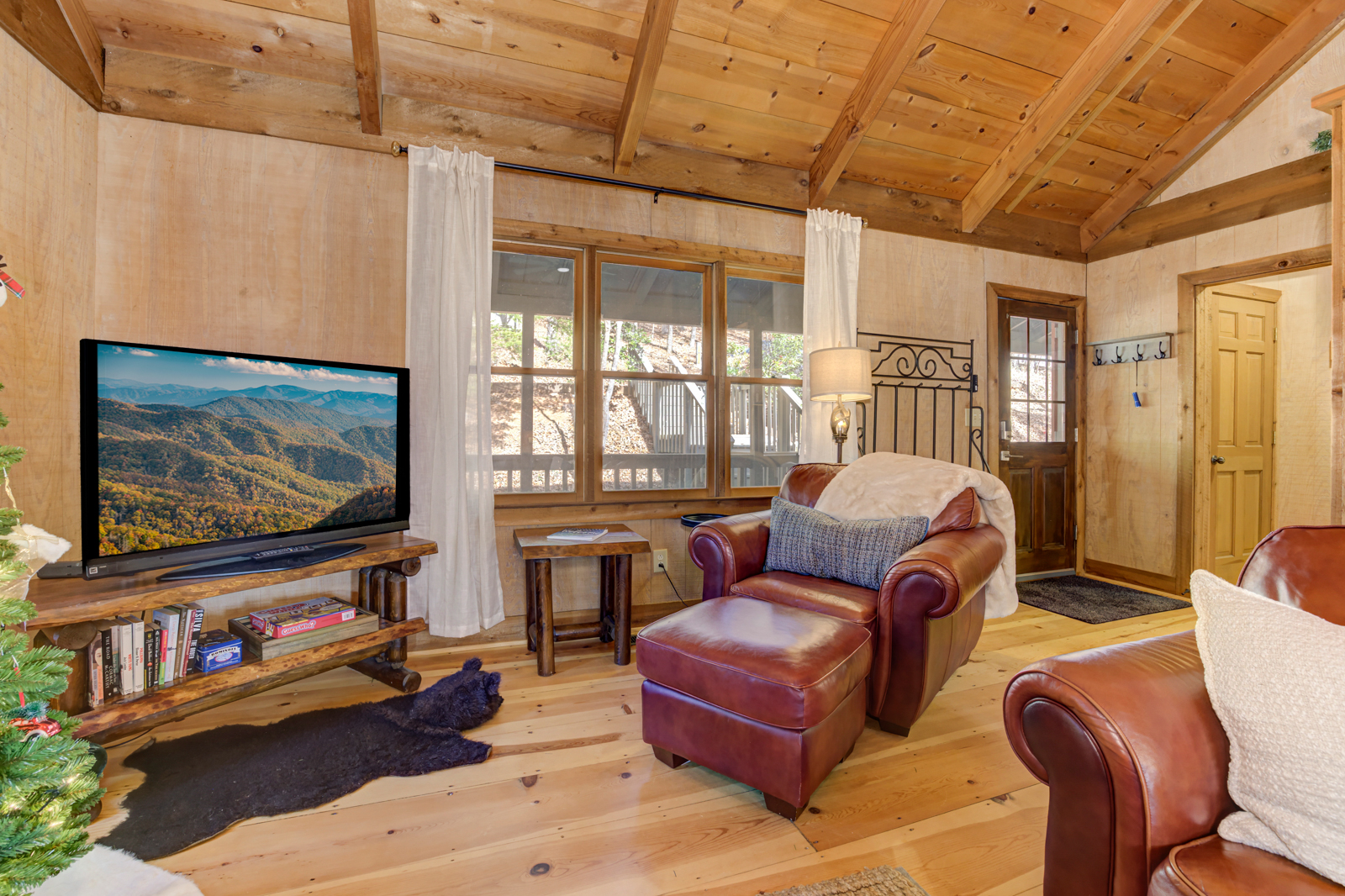 Outdoor dining and card games await at the table with an umbrella. There’s even a fire table topper for cozier moments outside. This semi-private Blue Ridge Mountain cabin also features a wicker lounge area with cushioned seats beneath blue or starry skies, a great place to kick back with a jar of moonshine and a few friends.