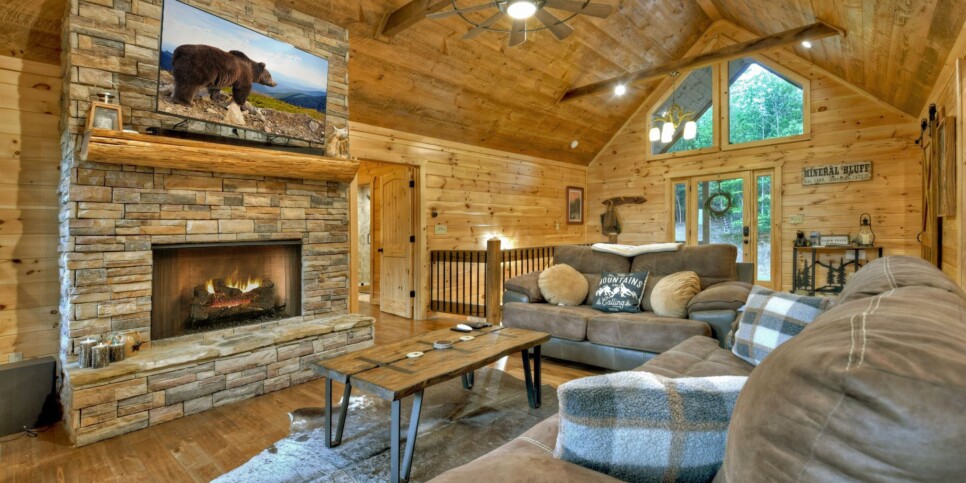 In this welcoming space, the coffee and end tables offer space to set drinks, phones, cards, and books as needed. A big screen TV means fun movie nights with loved ones in the Blue Ridge Mountains! And there’s an impressive gas log fireplace — with stacked stones and a beautiful wood mantlepiece — for even cozier evenings in North Georgia.