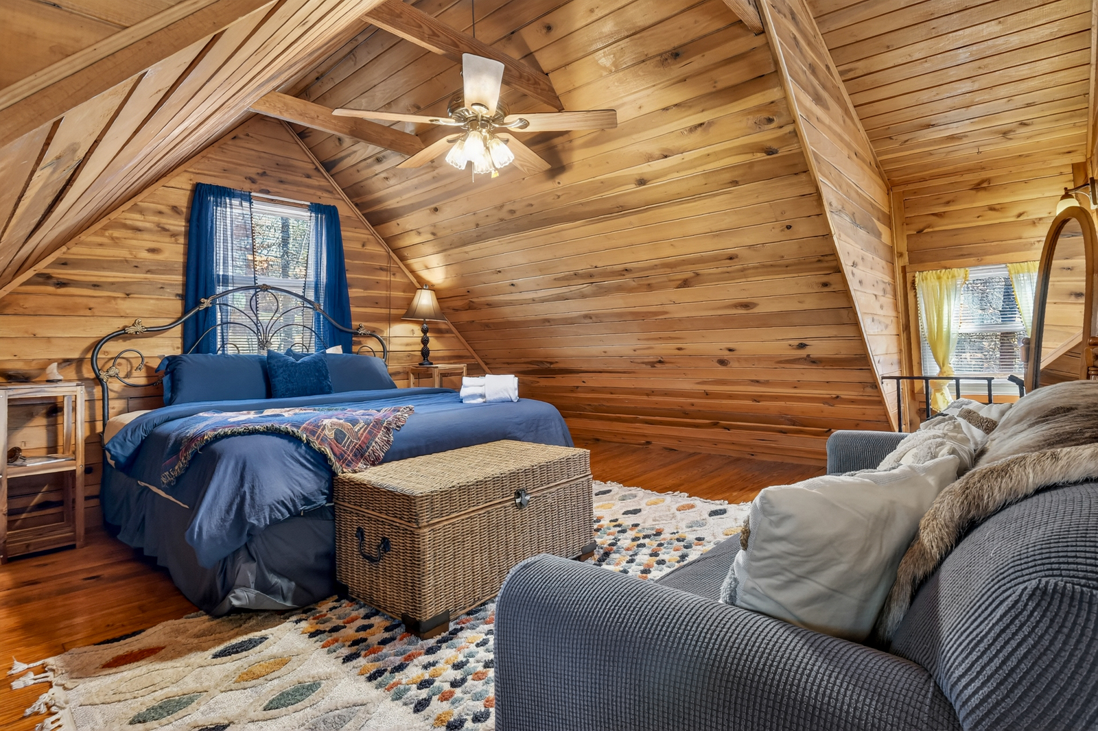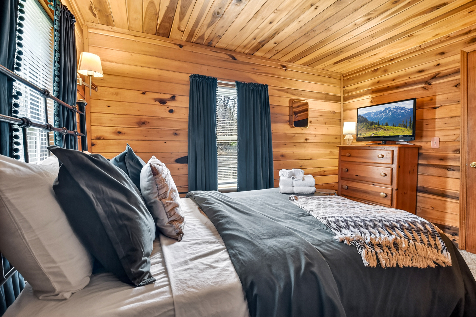 Serenity Woods features comfortable sleeping accommodations for up to 4 guests across a full and king sized bed, with thoughtfully arranged bedrooms designed for rest and relaxation. Each room provides a peaceful atmosphere, soft bedding, and a cozy retreat at the end of the day. Whether traveling as a couple, small family, or friends, the layout ensures everyone has a restful place to recharge.