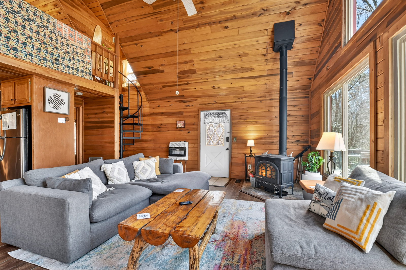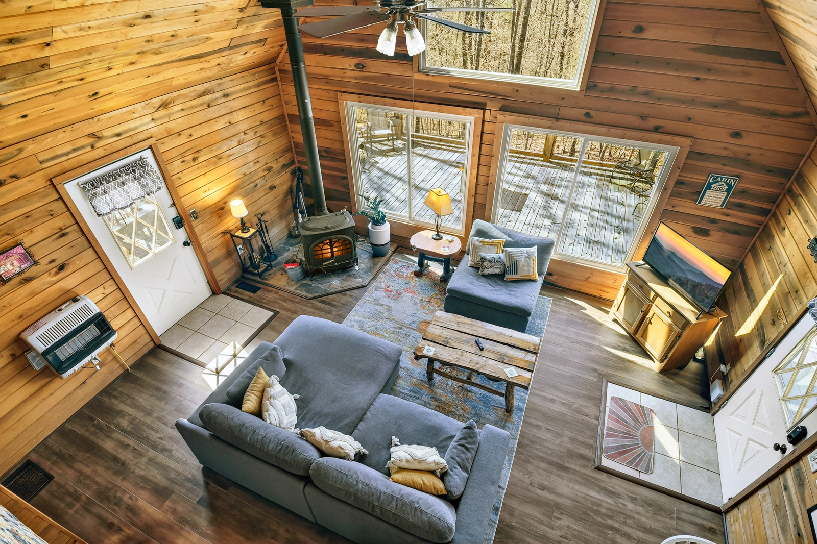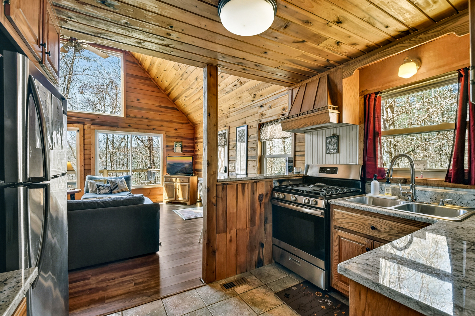 The inviting living room is designed for comfort and connection, blending rustic charm with cozy living spaces that feel like a true mountain hideaway. Relax by the fireplace after a day exploring the North Georgia mountains, watch your favorite DVDs on the TV, or gather with loved ones for conversation. This welcoming space is perfect for unwinding during your family vacation.