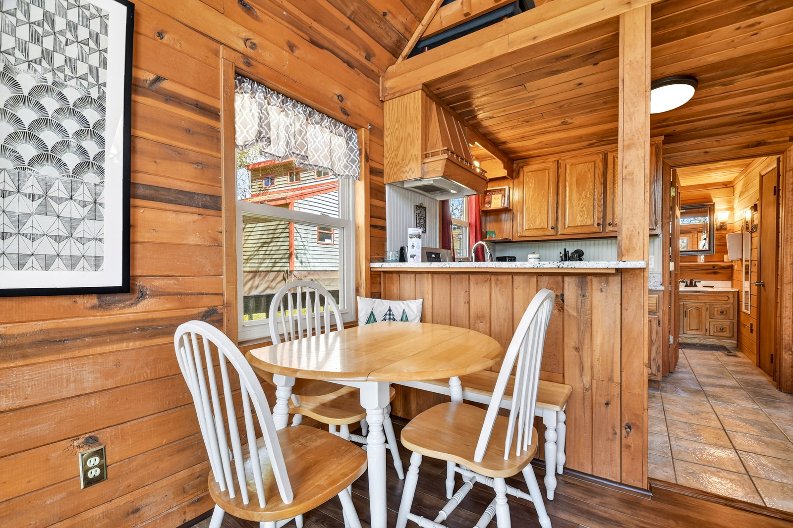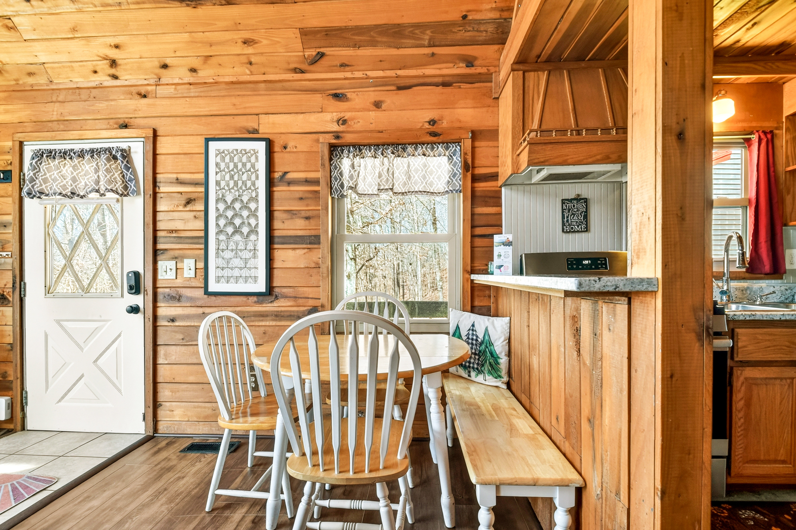 Adjacent to the kitchen, the dining area provides a cozy place to enjoy meals, play board games, or plan your next adventure. Whether you’re fueling up before a day of hiking in the Appalachian region or relaxing after exploring local attractions, this space encourages connection and shared moments.